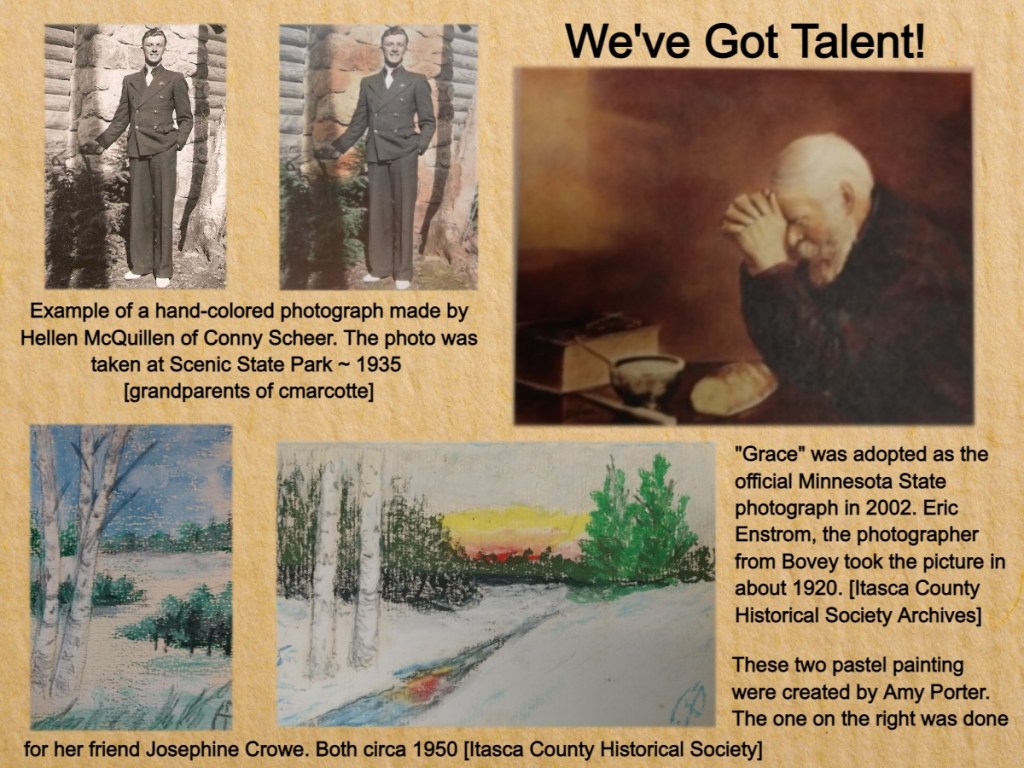 In the archives of the Itasca County Historical Society, I found a lovely pastel painting that was created by Mrs. Amy Porter. She lived and farmed with her husband Charles near Rabey, MN in northwest Aitkin County. One of the small painting she made was for a dear friend, Josephine (Burt) Crowe who lived in Grand Rapids. Amy painted many pictures, Christmas cards and birthday cards with pastel paints. The painting she did for Josephine Crowe was created on a 1953 tax receipt!
